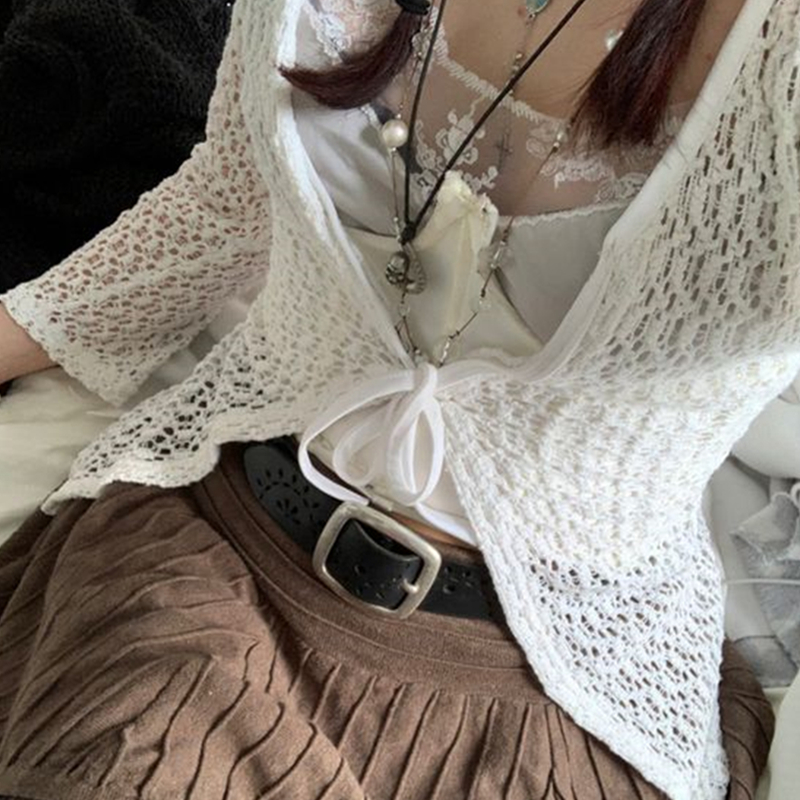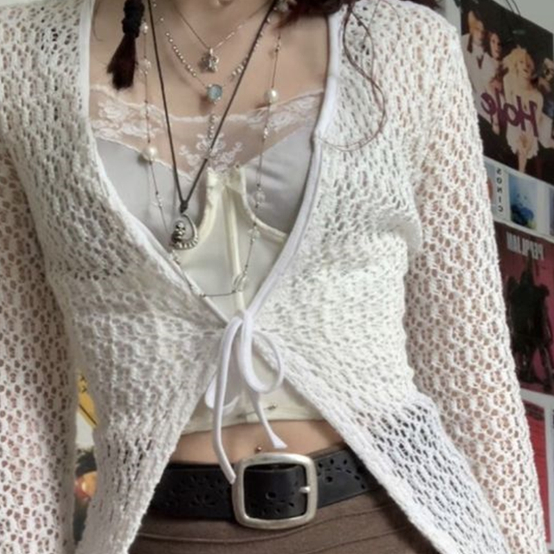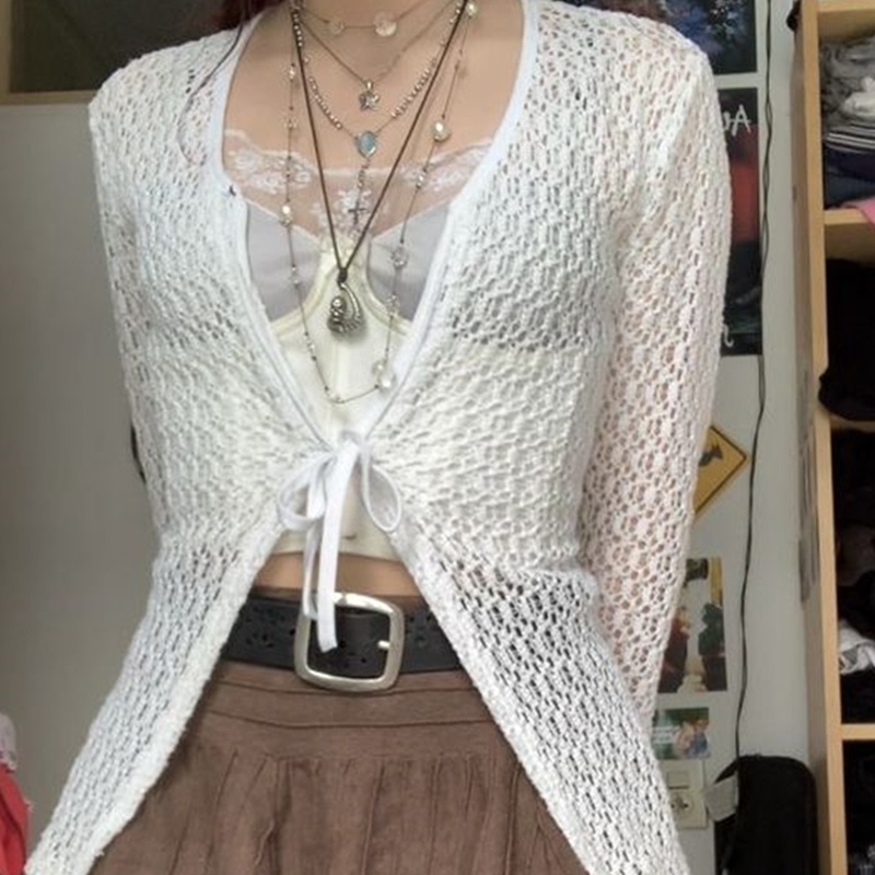 Женский модный Кардиган с длинным рукавом, однотонный вязаный свитер с завязками спереди, весенние легкие Прозрачные топы
