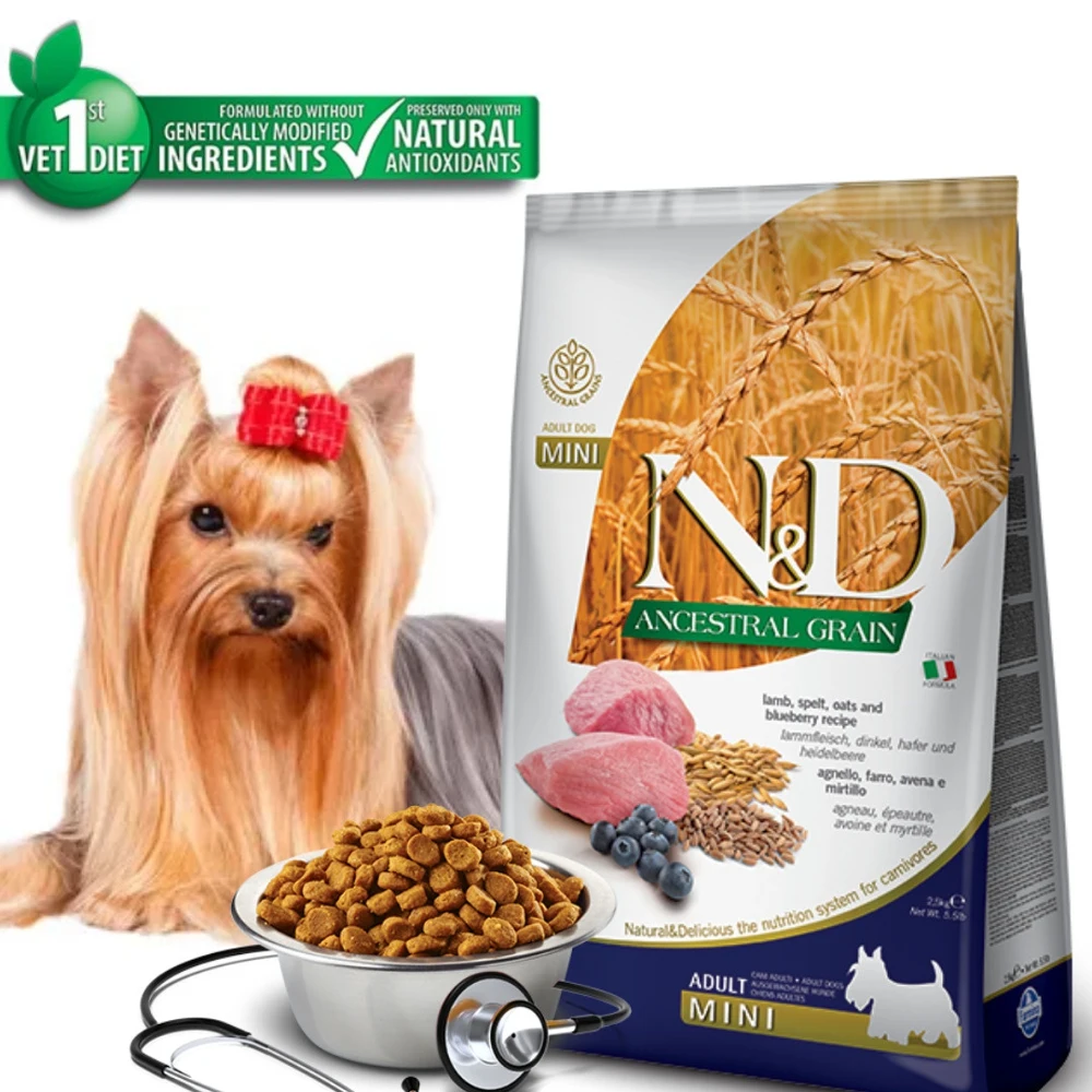 Farmina N&D Ancestral Grain Adult Mini Lamb & Blueberry Полнорационный корм для взрослых собак. Спельта, овес, ягненок, черника.Ингредиенты:Свежая баранина без костей (20%), дегидратированное мясо ягненка (18%), спельта (10%), овес (10%), дегидратированные цельные яйца, свежая сельдь, дегидратированная сельдь, животный жир, рыбий жир, пульпа сахарной свеклы, волокна гороха, сушеная морковь, мукa люцерны, инулин, фруктоолигосахариды, маннанолигосахариды, порошок черники(0,5%), сухие яблоки, порошок граната, дегидратированный сладкий апельсин, порошок шпината, подорожник (0,3%), порошок черной смородины, хлорид натрия, пивные дрожжи, корень куркумы (0,2%), глюкозамин, хондроитин сульфат, экстракт календулы (источник лютеина).Пищевые добавки на кгВитамин А 15000ME; витамин D3 1500ME; витамин Е 600мг; витамин С 150мг; витамин PP 37,5мг; пантотеновая кислота 15мг; витамин B1 4,5мг; витамин В2 7,5мг; витамин В6 6мг; витамин H 0,38мг; Фолиевая кислота 0,45мг; витамин B12 0,1мг; холин хлорид 2500мг; бета-каротин 1,5мг; Цинк 910мг; Марганец 380мг; Железо 250мг; Медь 88мг; Селен 0,40мг; DL-метионин 4000мг; Таурин 1000мг; L-Карнитин 300мг. Специальные добавки: экстракт алоэ вера 1000мг; экстракт зеленого чая 100мг; Экстракт розмарина. Антиоксиданты: токоферол из экстрактов натурального происхождения. Питательные веществаСырой протеин 28,00%; сырой жир 18,00%; сырая клетчатка 2,90%; сырая зола 8,20%; кальций 1,40%; фосфор 1,10%; Омега-6 3,30%; Омега-3 0,90% (в том числе DHA 0,50%; EPA 0,30%); глюкозамин 1200мг/кг; хондроитин сульфат 900мг/кг.