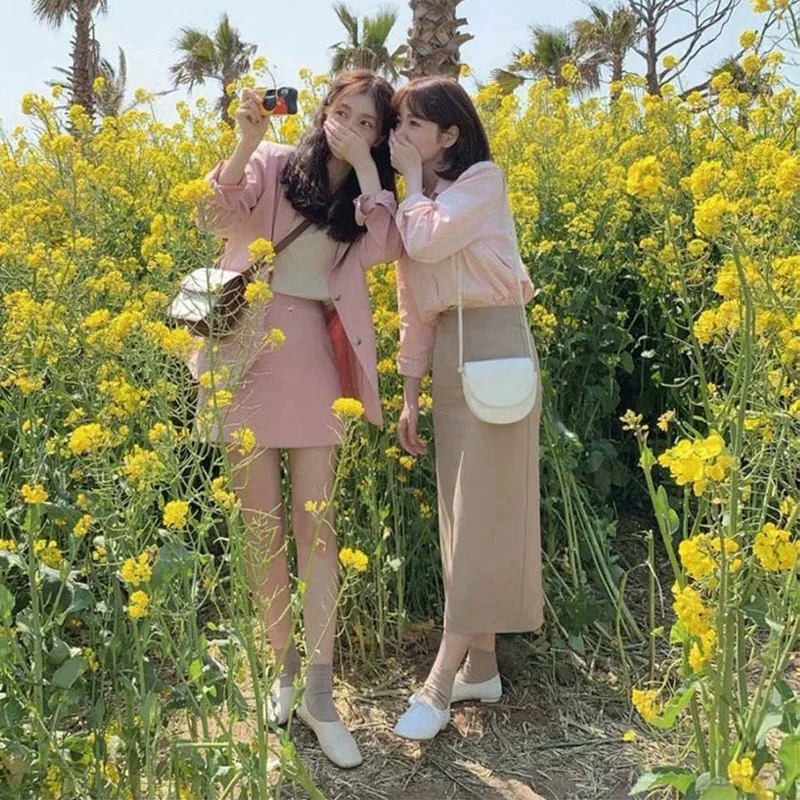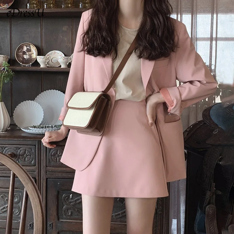 EDressU/женский костюм из 2 предметов, розовый пиджак, юбка, Офисная Корейская однобортная деловая верхняя одежда из двух предметов, ZX-6