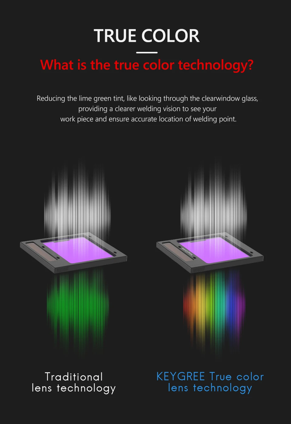 Технология True Color обновляет до KeyGree Сварочные шлемы-улучшает видимость и уменьшает напряжение глаз мини-Захватывает традиционную зеленую окраску на экране шлема.