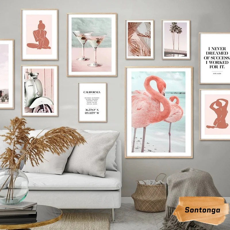 Современный пейзаж листья розовый пляж бокал для вина Йога Фламинго любовь кокосовое дерево Po...