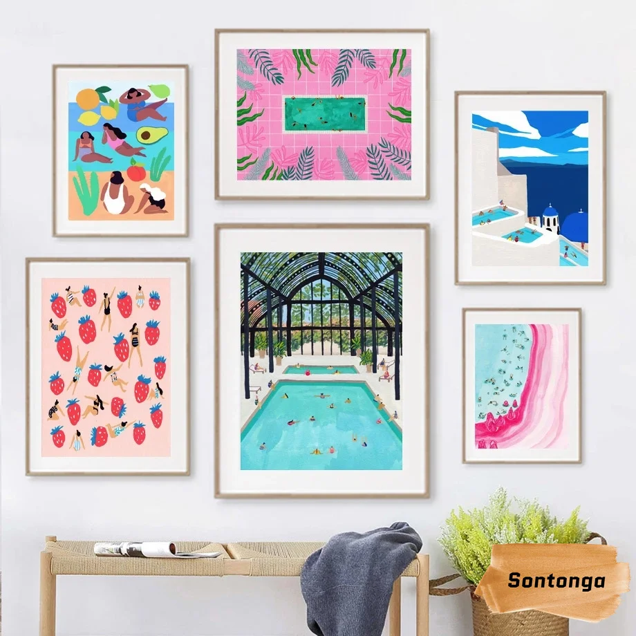 Мультяшный пейзаж, Картина на холсте бассейн тропический плакат растений комната Abstr...