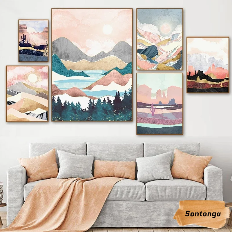 Пейзаж в скандинавском стиле, природные горы, картина маслом, постер с солнцем, холст, живопись...