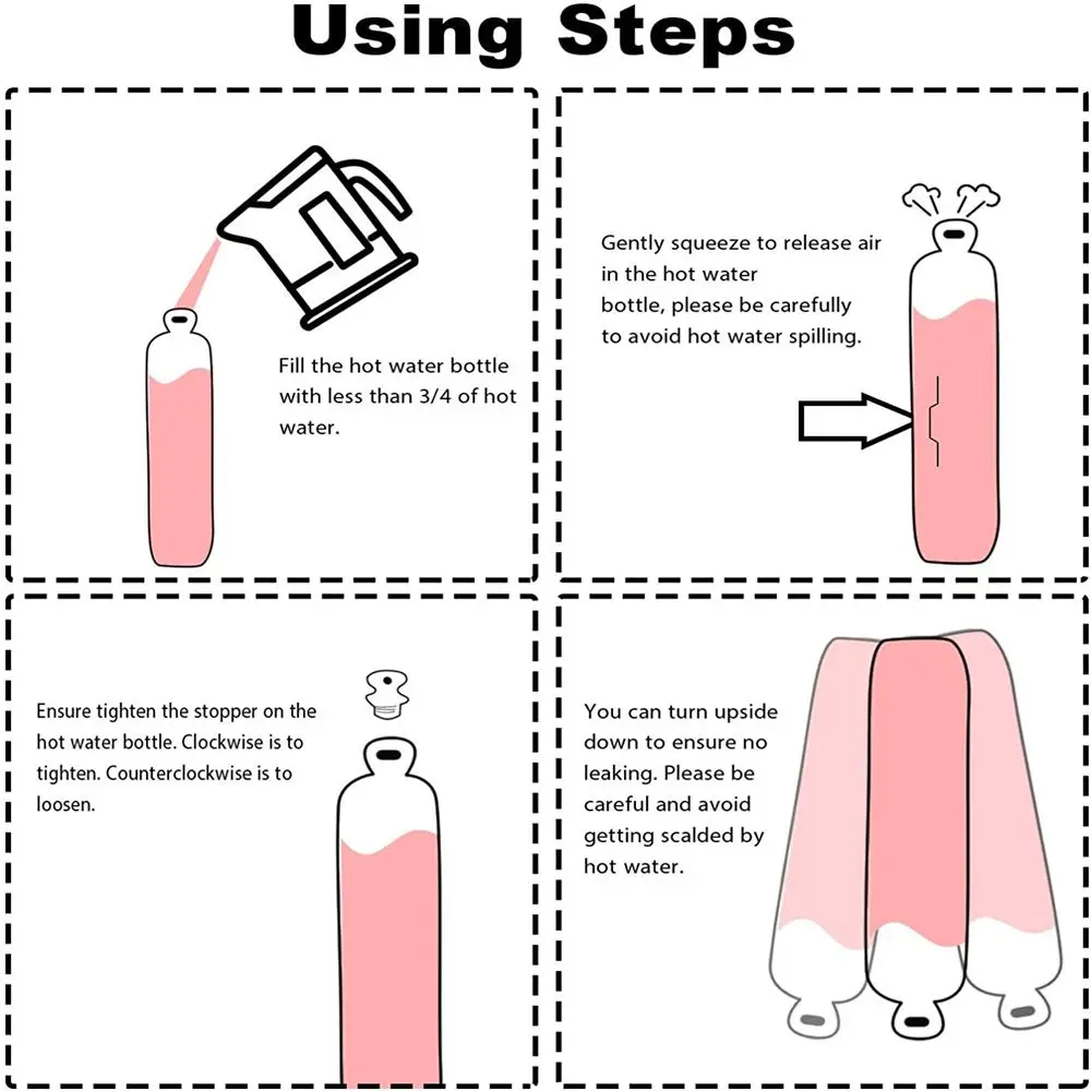 4. Предотвращение протекания горячей воды: Изготовлен из 100% чистого натурального каучука, который мягкий, гибкий и складной. Белая крышка с 5 нитями плотно прилегает к бутылке с горячей водой и предотвращает протекание. Пожалуйста, затяните пробку, вы можете перевернуть вверх дном, чтобы не протекать. Будьте внимательны и избегайте ожогов.
