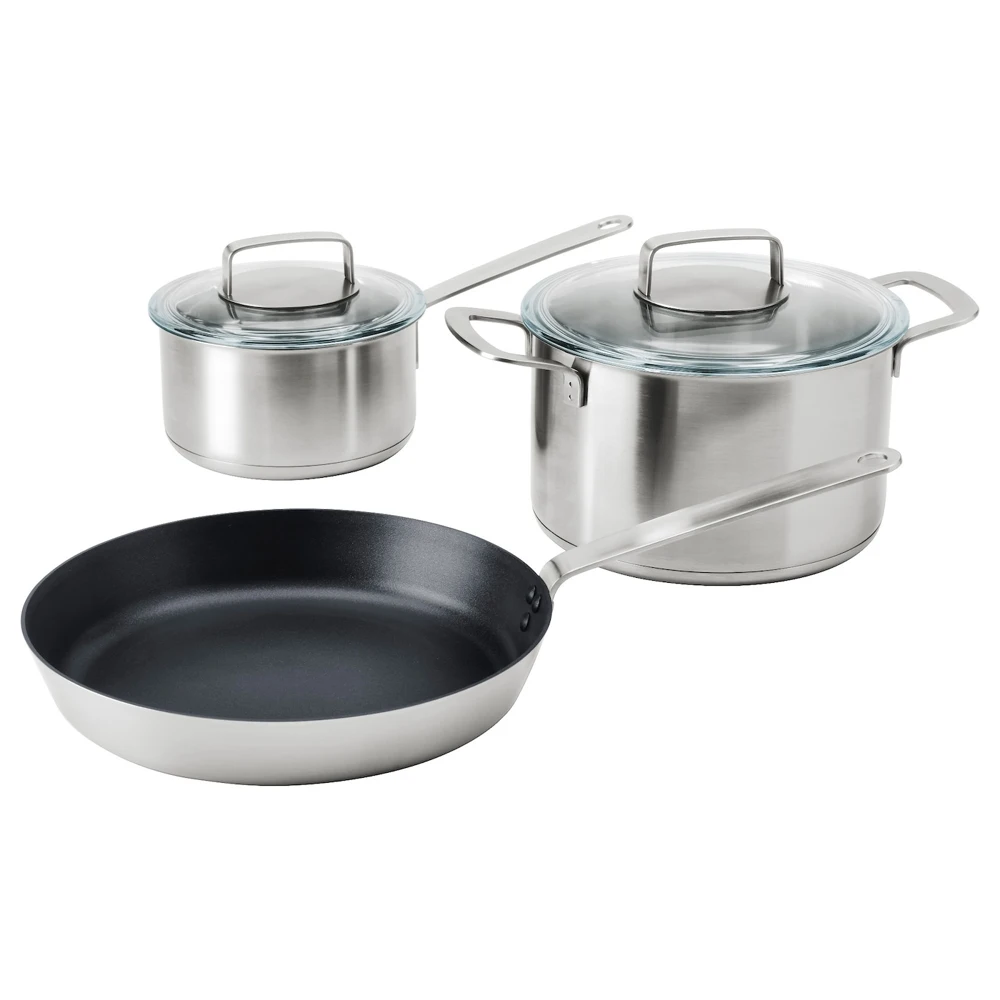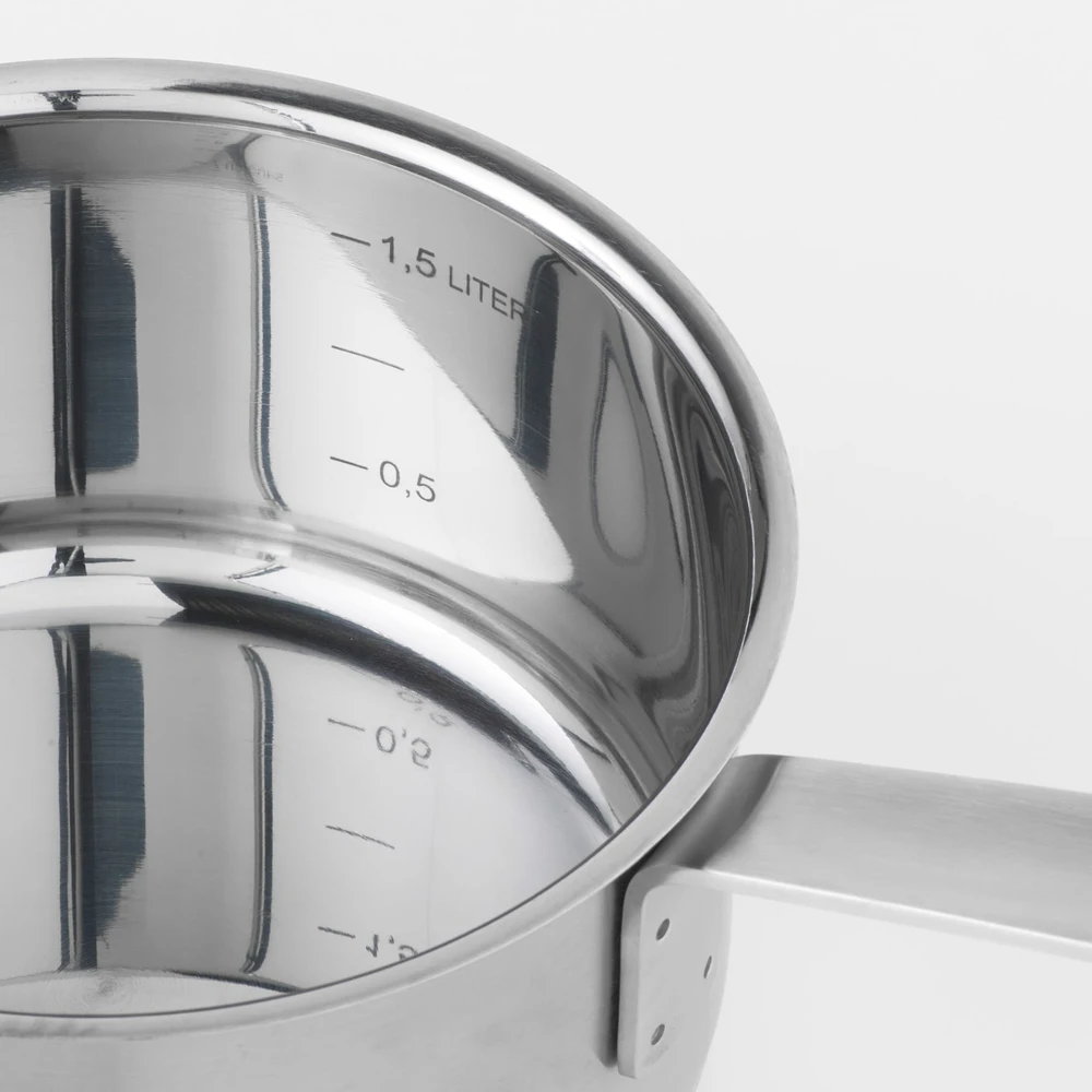 Кастрюля и ковш с толстым дном из двух слоев нержавеющей стали, между которыми размещен слой алюминия. Это обеспечивает равномерное нагревание и предотвращает прилипание и пригорание пищи.