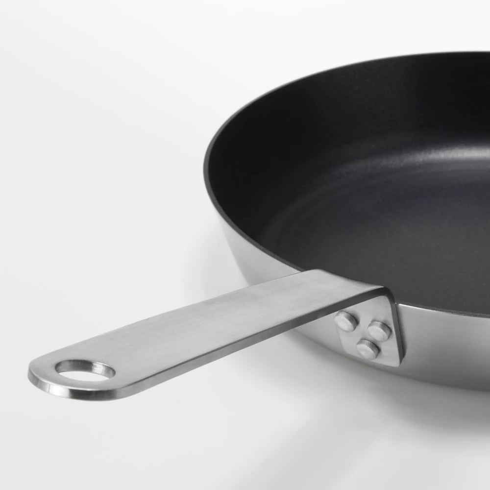 Сковорода нагревается равномерно, т. к. ее дно и стенки сделаны из одинакового по толщине трехслойного материала, состоящего из слоя алюминия между двумя слоями нержавеющей стали.