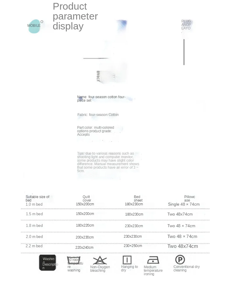 1.5/1.8m bed: quilt cover 200×230cm, bed sheet 245*250cm, pillowcase 48*74cm*2