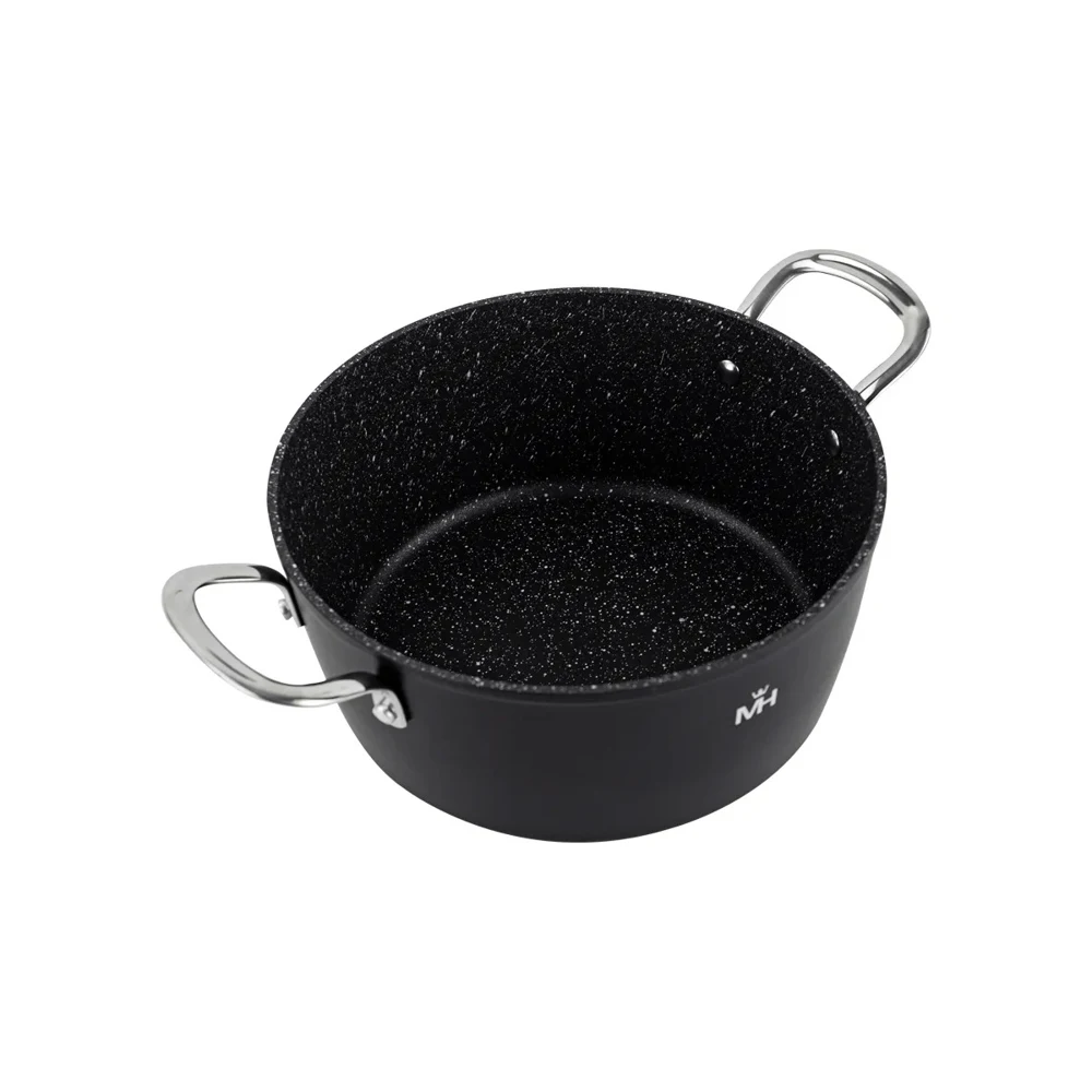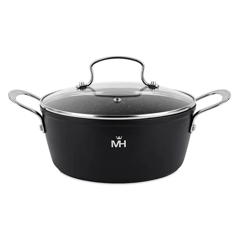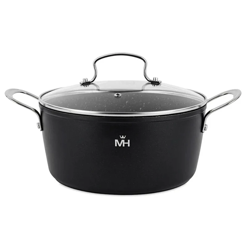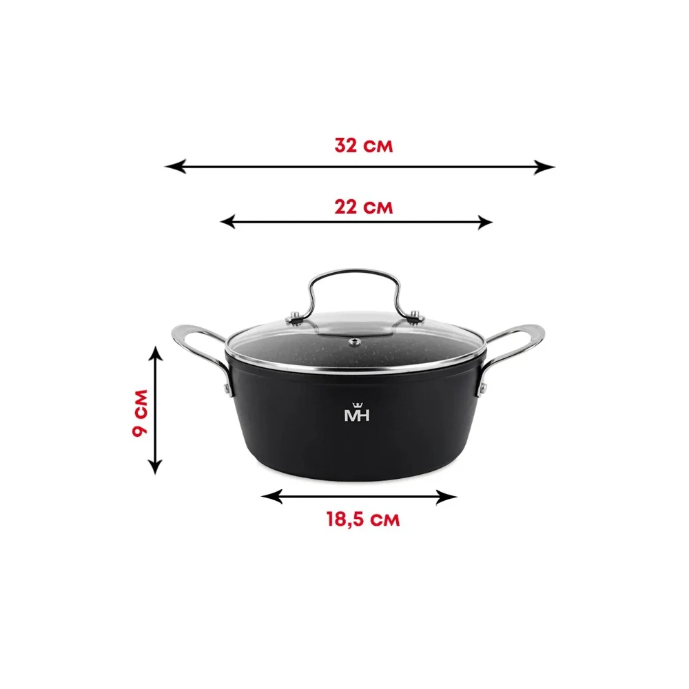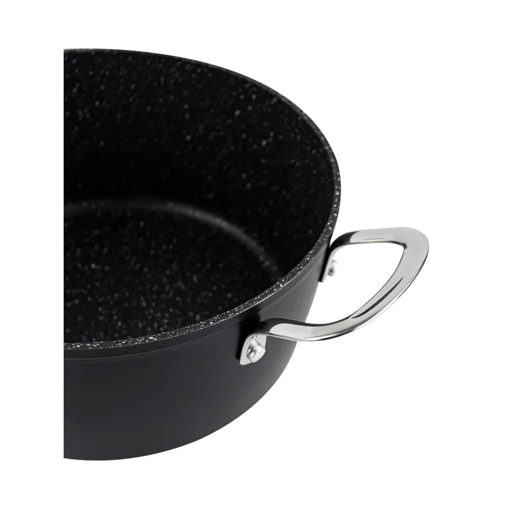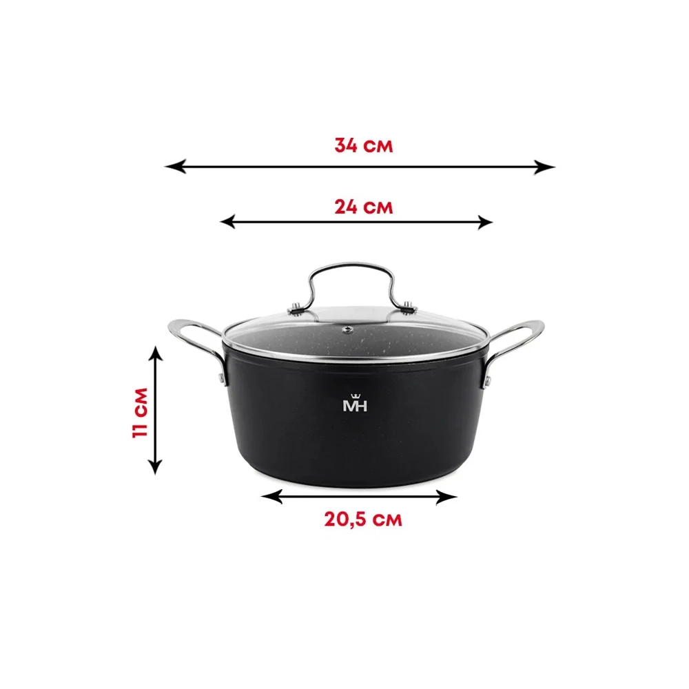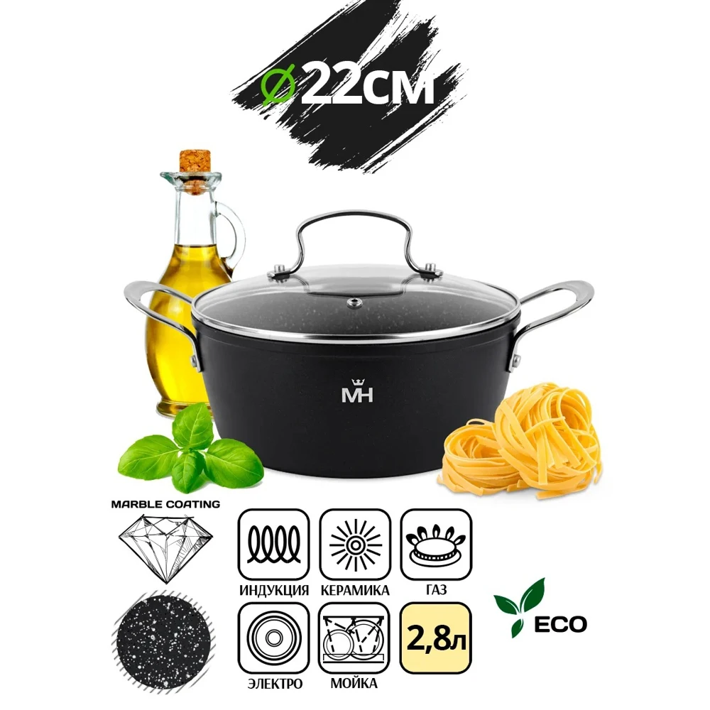 Алюминий, мраморное покрытие. Термоаккумулирующее дно, толщина 4 мм, толщина стенок 2.5 мм. Крышка из закаленного стекла. Подходит для всех видов плит, включая индукцию.