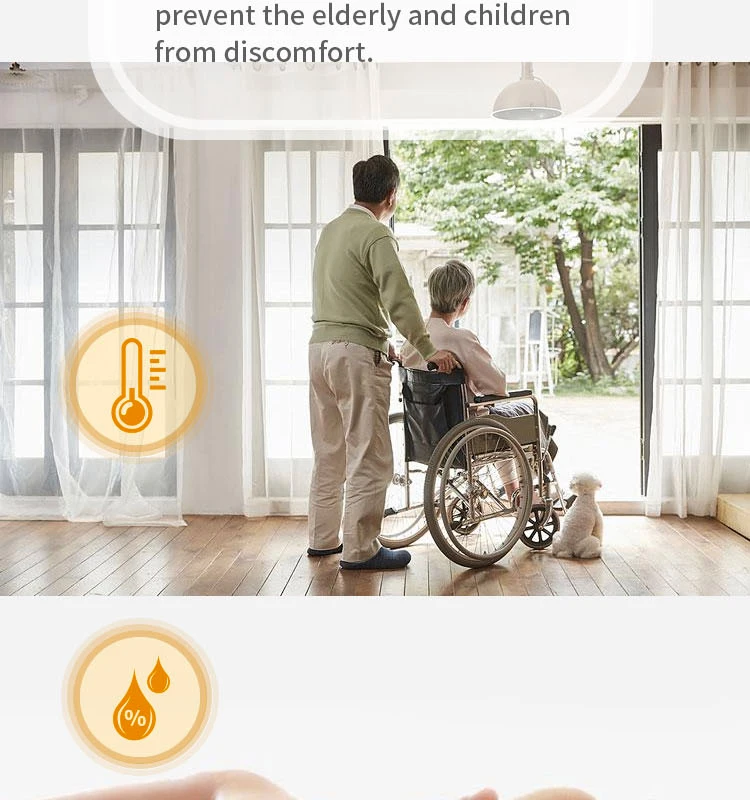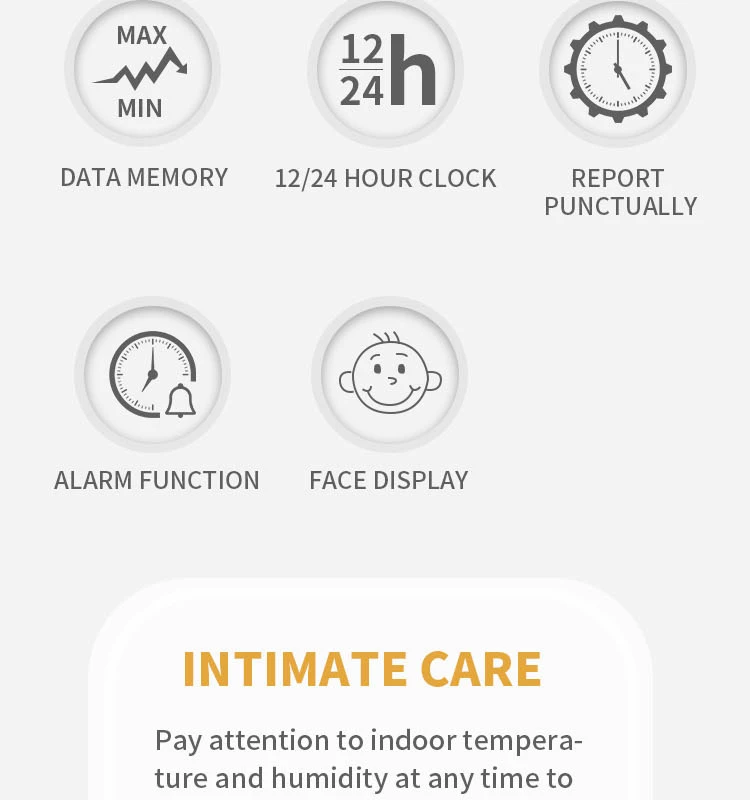 Индикатор комфорта со значком лица: температурный датчик влажности оснащен значками лица, чтобы быстро указать состояние сухого/комфортного/влажного воздуха, чтобы уведомить вас о необходимости настройки увлажнителя или осушителя воздуха соответственно и обеспечить, чтобы вы всегда были в наиболее комфортной среде