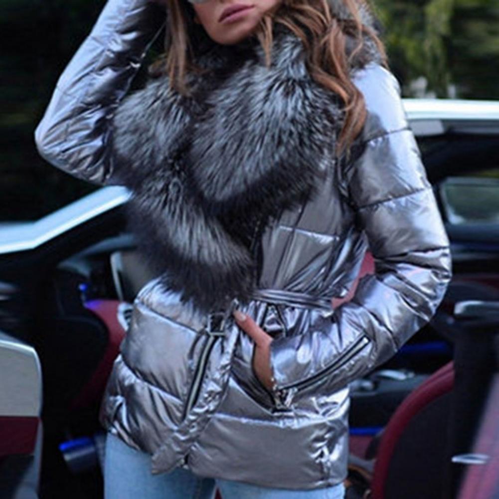 Женская куртка на молнии с яркой поверхностью, зимняя женская куртка с воротником из искусственного меха на осень и зиму