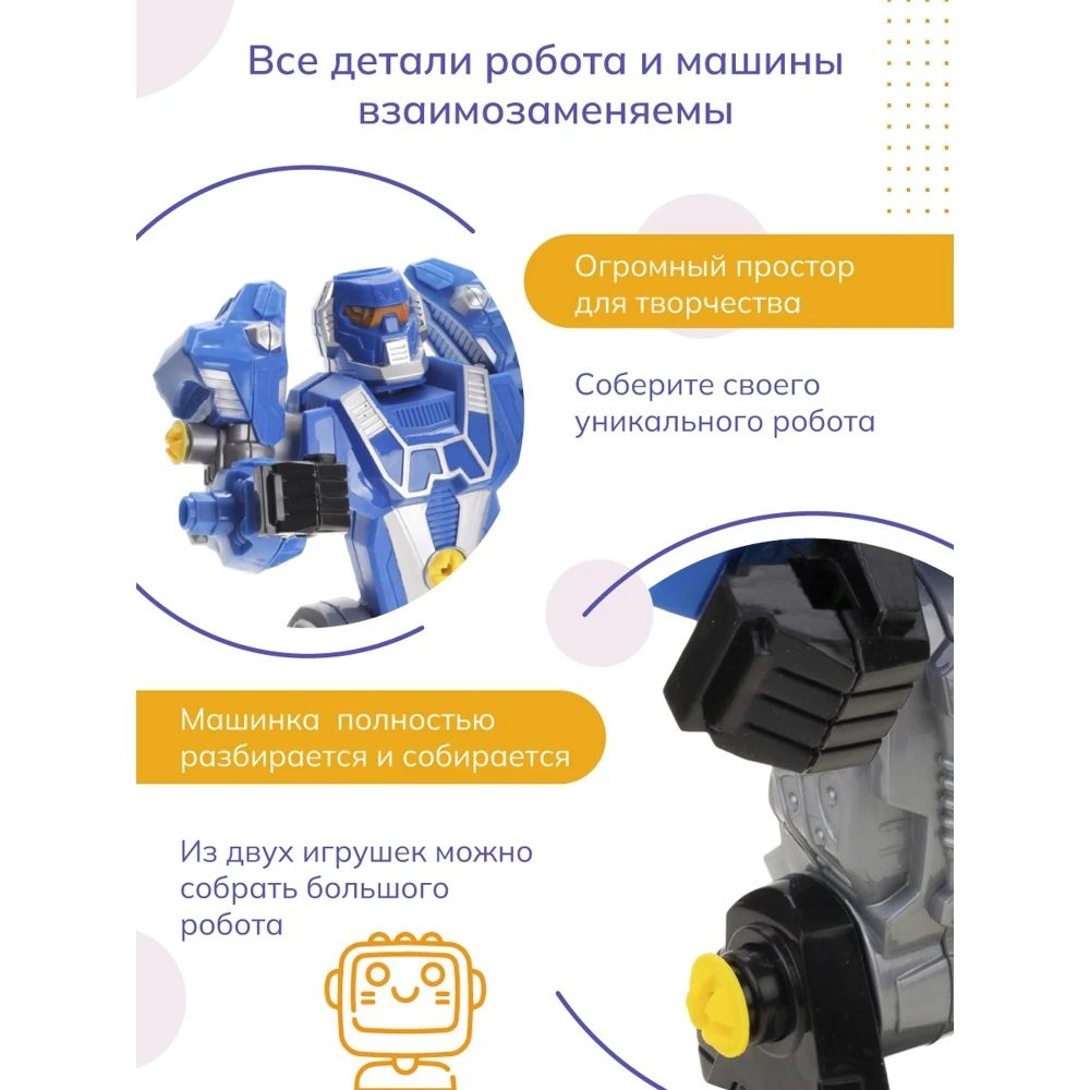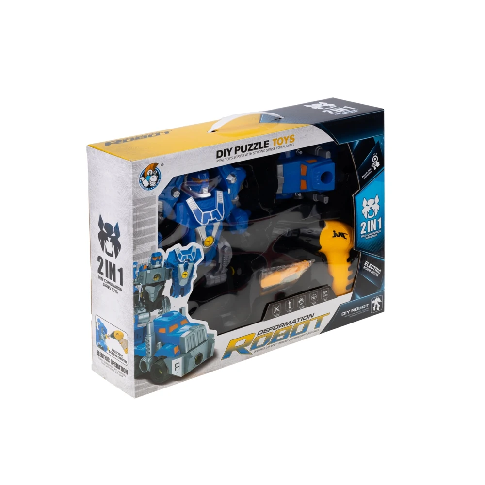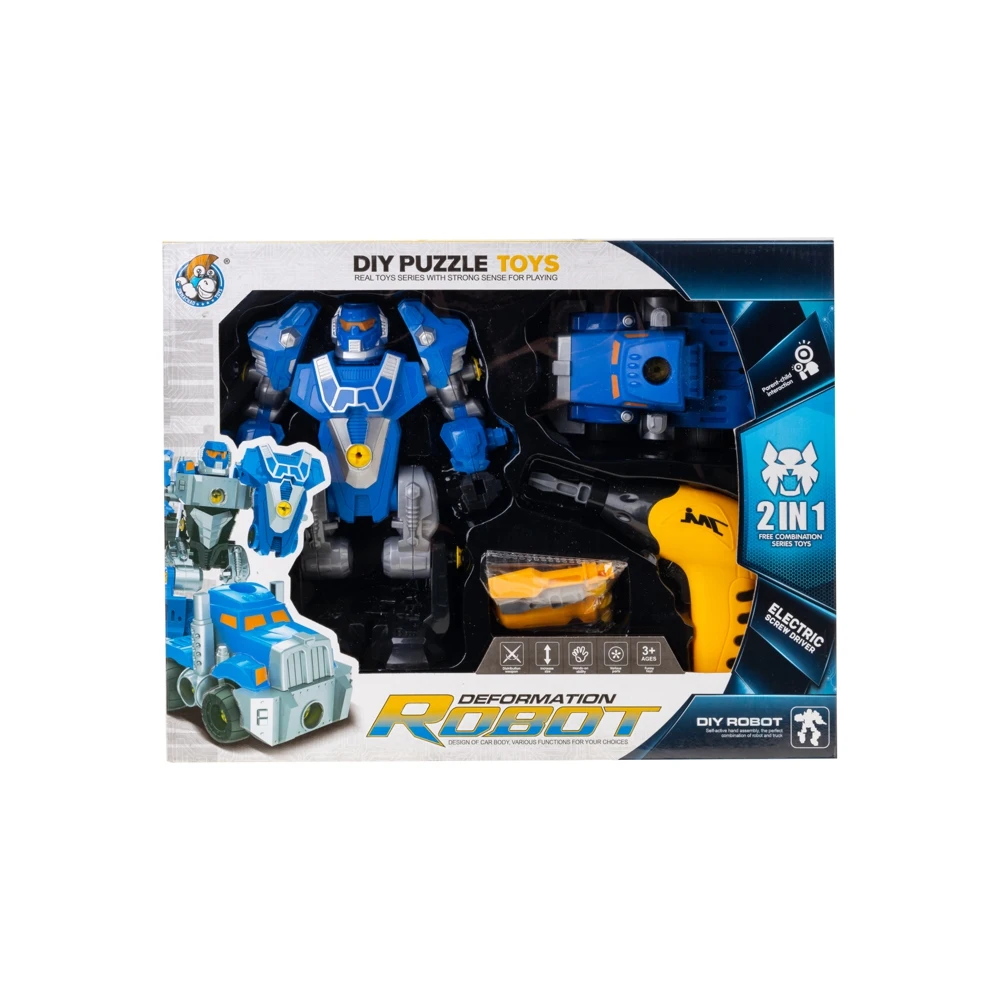 Робот-трансформер станет отличным подарком для юного конструктора. Полнофункциональный робот с оружием, конечности игрушки легко подвижные, сборно-разборная конструкция, можно менять местами и собирать робота на свое усмотрение. В комплект входит машинка, которая также разбирается и собирается. Детали машины и робота легко совмещаются между собой и заменяются, это дает пространство для фантазии юного конструктора в сборке уникального робота из двух игрушек. Для простоты и удобства сборки в набор входит автоматический шуруповерт с подсветкой и сменными сверлами, отвертка и дополнительные шурупы. С роботом-трансформером ребенок не только будет увлекательно проводить время в игре, но и обучится тонкостям конструирования, планирования, познакомится с такими инструментами как отвертка и шуруповерт и научится ими правильно пользоваться. Отличный подарок для мальчика.
