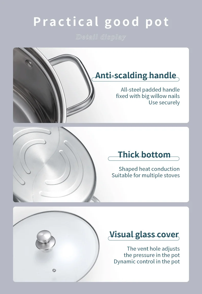 1. Китайский горячий горшок с крышкой и ковш для супа. Доступны два стиля и несколько размеров. И общее использование для газовой и индукционной плиты.