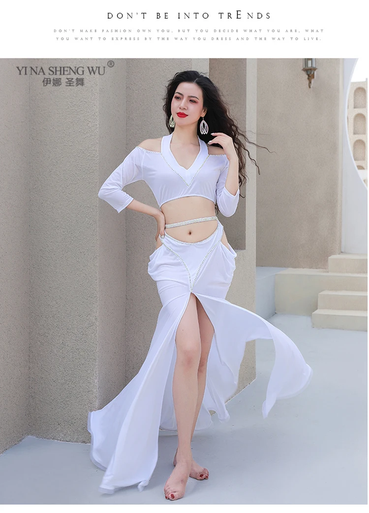 Новый женский шикарный костюм для танца живота, комплект из 2 предметов, стразы, топ, висячая шея, длинная юбка, тренировочная одежда белого и красного цвета