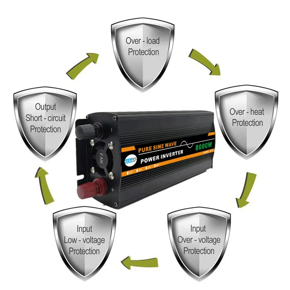 6. Мульти-Защита: Встроенные предохранители для защиты аккумулятора и устройств, безопасная конструкция зарядки, безопасная технология зарядки и охлаждающий вентилятор предотвращает автомобильный преобразователь питания обеспечивает защиту от перегрева, подзарядки под/перенапряжения, перегрузка, короткое замыкание, выключение температуры и меньшее напряжение звуковой сигнализации, новый дизайн DC терминалы предлагают высокий ток DC вход.