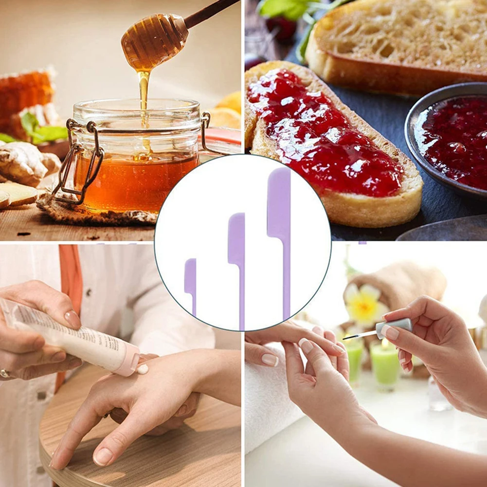 * 2. Набор силиконовых шпателей изготовлен из 100% высококачественного пищевого силикона с сердечником из нержавеющей стали внутри, который не содержит BPA, нетоксичный и многоразовый с длительным подъемом обслуживания, широко используется для еды и макияжа. Мини-шпатель идеально подходит для приготовления пищи в кухонных баночках, косметических бутылках и других узких помещениях, без отходов.