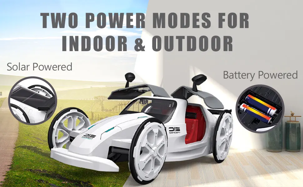 -Этот спортивный автомобиль на солнечных батареях может питаться от солнца или 2 батареек АА (не входят в комплект). Нет необходимости беспокоиться об отсутствии электричества во время игры на открытом воздухе, и вы можете использовать режим питания от аккумулятора во время игры на открытом воздухе.