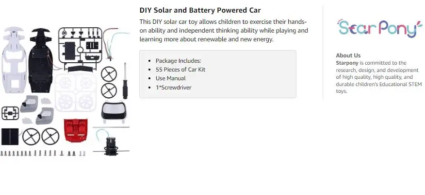 -Все части этого солнечного игрушечного автомобиля изготовлены из безопасного и нетоксичного АБС-пластика и устойчивы к падению и ударам и не причинят никакого вреда вашим детям во время игры. Он поставляется с простой в использовании, пошаговыми инструкциями для всех различных вариантов роботов на солнечных батареях.