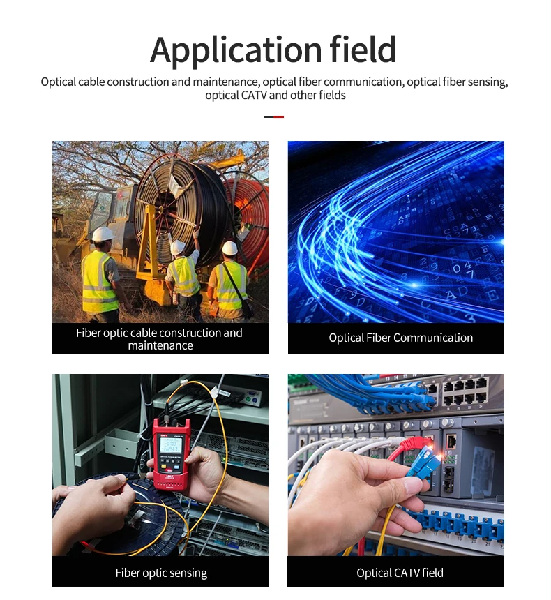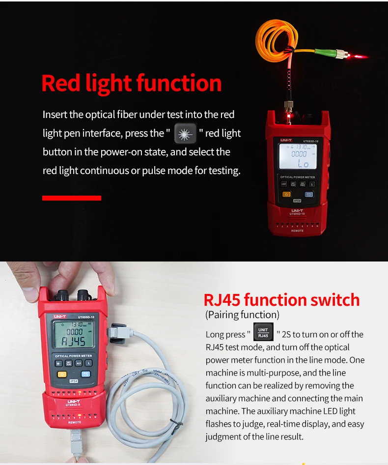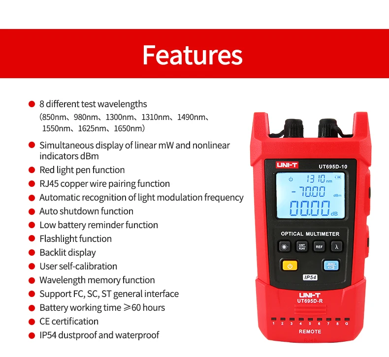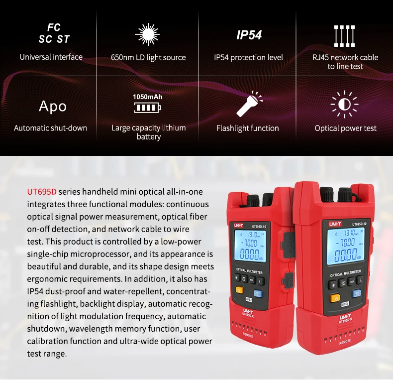 UT695D-10 включает в себя оптический измеритель мощности, визуальный локатор неисправностей, фонарик и удаляемый тестер. UT695D-10 используется для измерения мощности оптического сигнала, испытания на потерю оптической линии, испытания на потерю вставки оптического устройства, оптического обнаружения неисправностей, определения местоположения оптической точки поломки, сквозная оптическая идентификация и многое другое. Разработан с функцией защиты от пыли и воды IP54, UT695D-10 может быть применен для строительства и обслуживания оптического кабеля, оптической связи, оптического зондирования, оптического CATV и других материалов.
