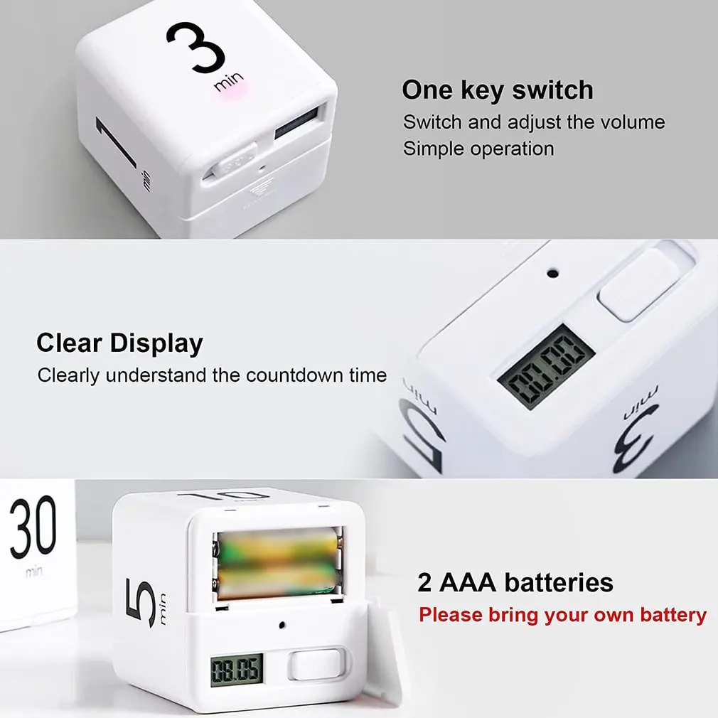 4. Многофункциональность: предустановленный таймер подходит для приготовления пищи, работы, чтения, обучения, игр, занятий спортом, уменьшения помех и поддержания внимания. Простая форма кубика-идеальный подарок для людей, у которых нет ощущения времени.