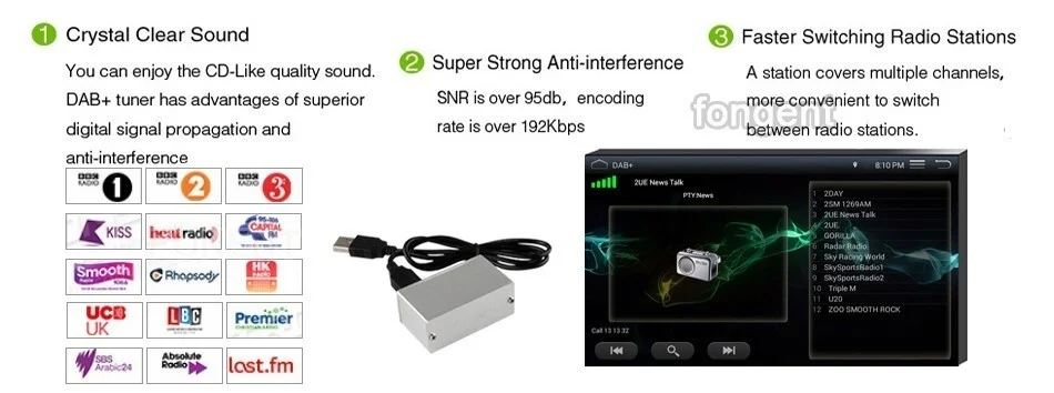 Dab + Поддержка 1. Подключите с DAB + Box через порт USB для использования функции DAB +. 2. Ввод цифровых радиопрограмм и сенсорное управление. 3. Сенсорный экран для поиска программ. Советы: не включая DAB + BOX, предлагаем вам купить его у нас, пожалуйста, нажмите на картинку: