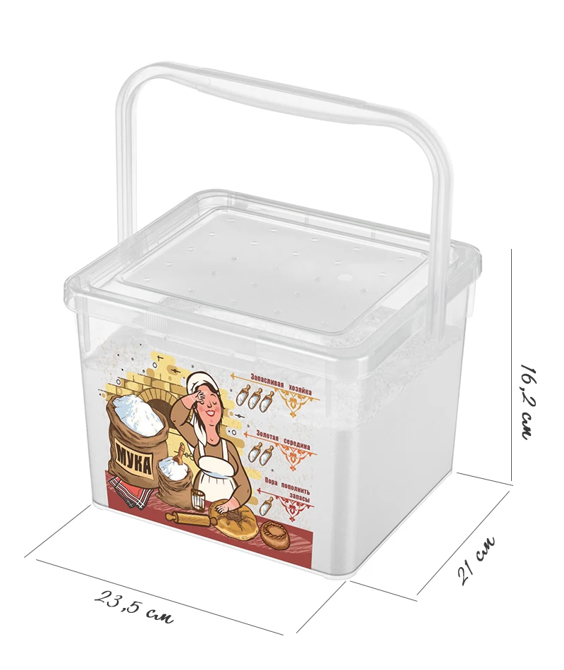 Удобная прочная ручка помогает переносить контейнер под муку с места на место.
