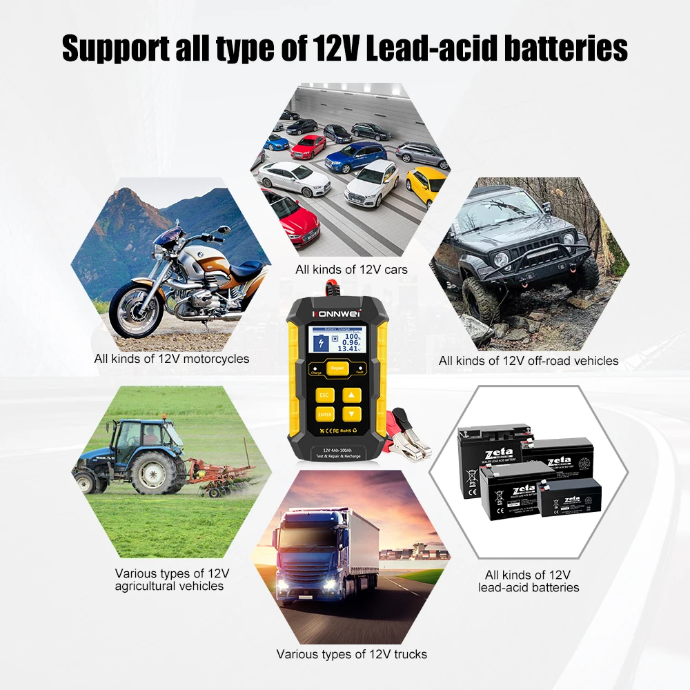KONNWEI KW510 поддерживает зарядку всех 12V свинцово-кислотные аккумуляторы для мотоциклов