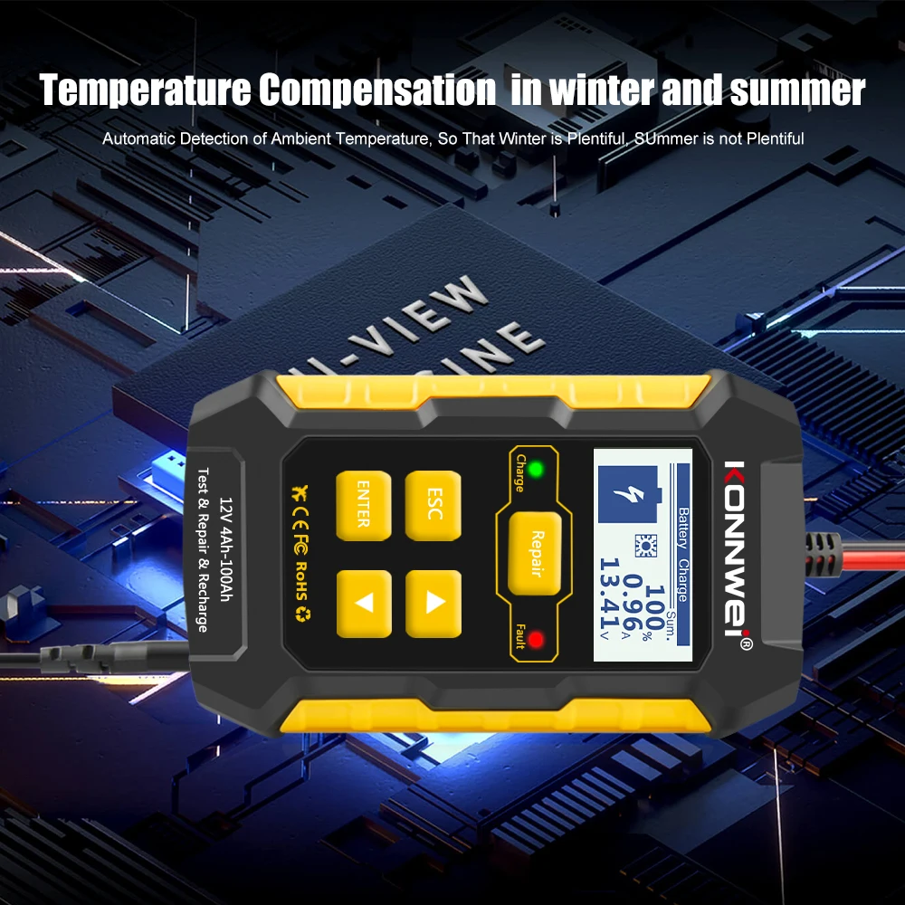 KONNWEI KW510 мощный 12V Батарея Зарядное устройство и ремонт инструмента полностью автоматическая Батарея инструмент: заряд батареи по операциям всего 2 вольт, максимальная выходная мощность 12 вольт 5-amp. Зарядное устройство KW510 не только помогает заряжать батареи, но и адаптирует новейшую технологию импульсного ремонта, ремонт одним нажатием кнопки и автоматически обнаруживает сульфат батареи и расслоение кислоты, чтобы вернуть батареи к жизни и восстановить их производительность.