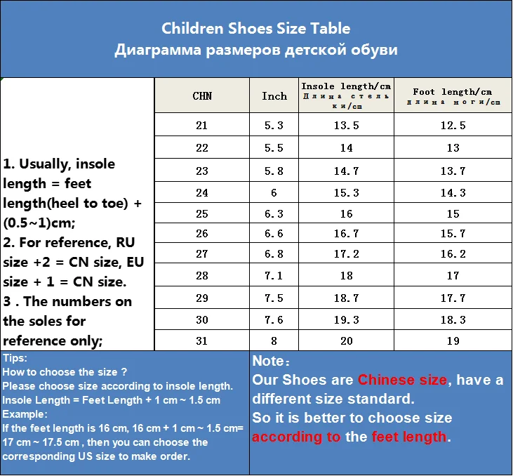 2. Пожалуйста, измерьте длину ступни вашего ребенка, см. Таблицу размеров, а затем выберите обувь для вашего ребенка.