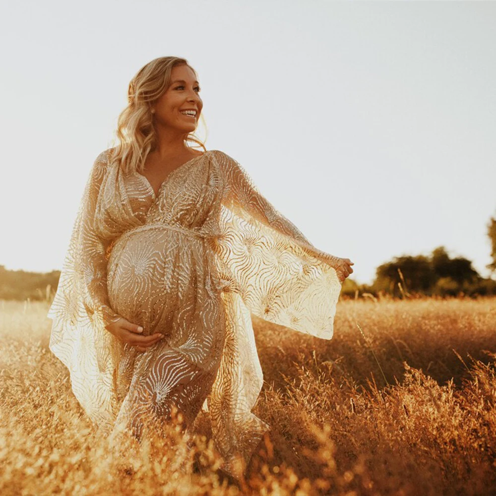 Это платье также изготовлено с разрезом, что делает его идеальным для демонстрации ребенка. Сделано в блестящих пайетках, это платье идеально подходит для вашей фотосессии по беременности и родам.