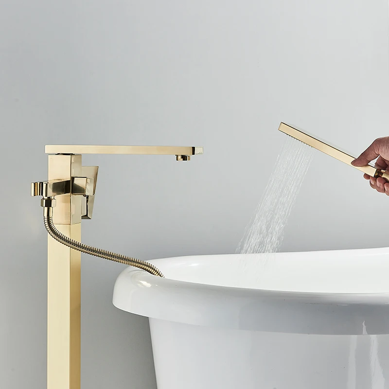 Матовый золотой напольный кран для ванной комнаты, набор для душа, подставка для ванной, кран с ручным душем, горячая холодная вода, квадратный стиль
