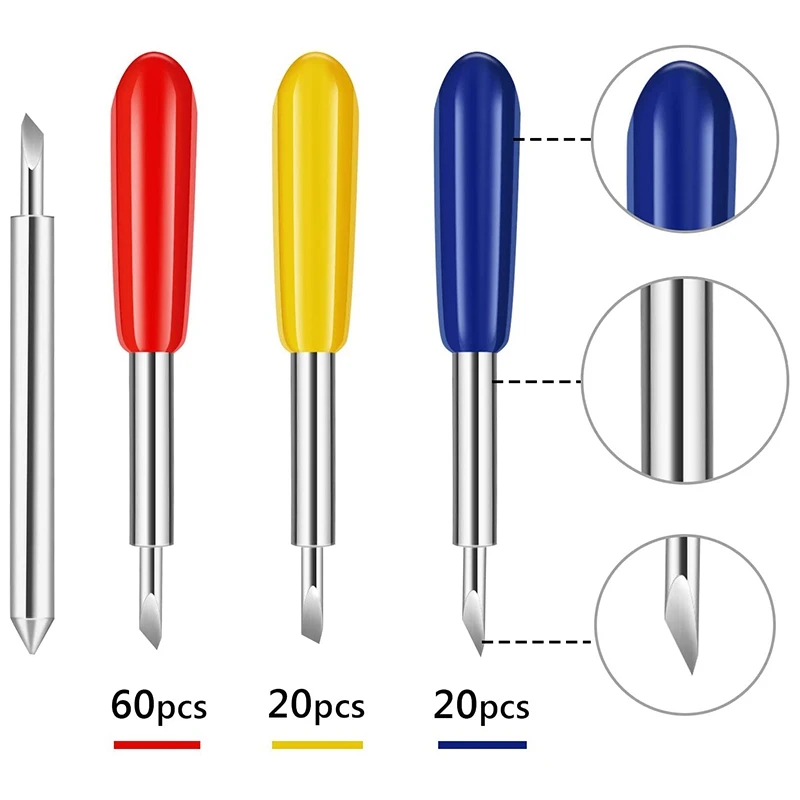 [100 шт. режущих лезвий в общей сложности] 100 шт. Замена режущего элемента лезвия в общей сложности включает 60 шт. 45 градусов Стандартные лезвия (красная крышка) 20 шт. 60 градусов лезвия глубокой резки (синяя крышка) 20 шт. лезвия 30 градусов. (Желтая крышка)