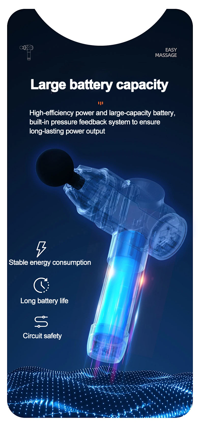 Быстрая зарядка: массажер оснащен высококачественной литиевой батареей емкостью 2400 мАч, которая может работать около 3 часов после каждой зарядки, устройство может быть быстро заряжено.