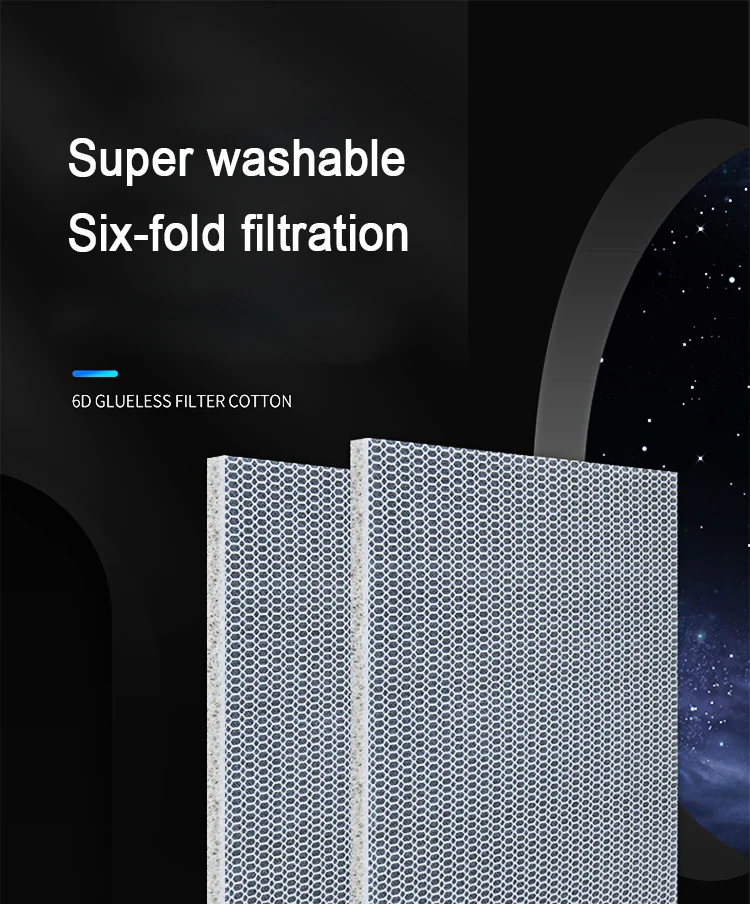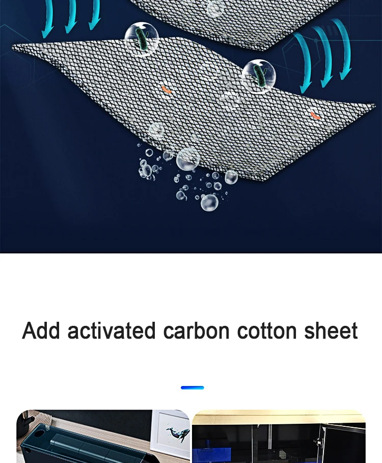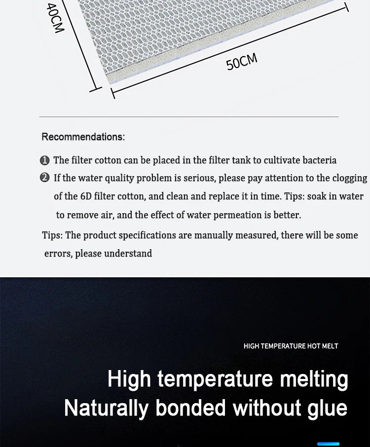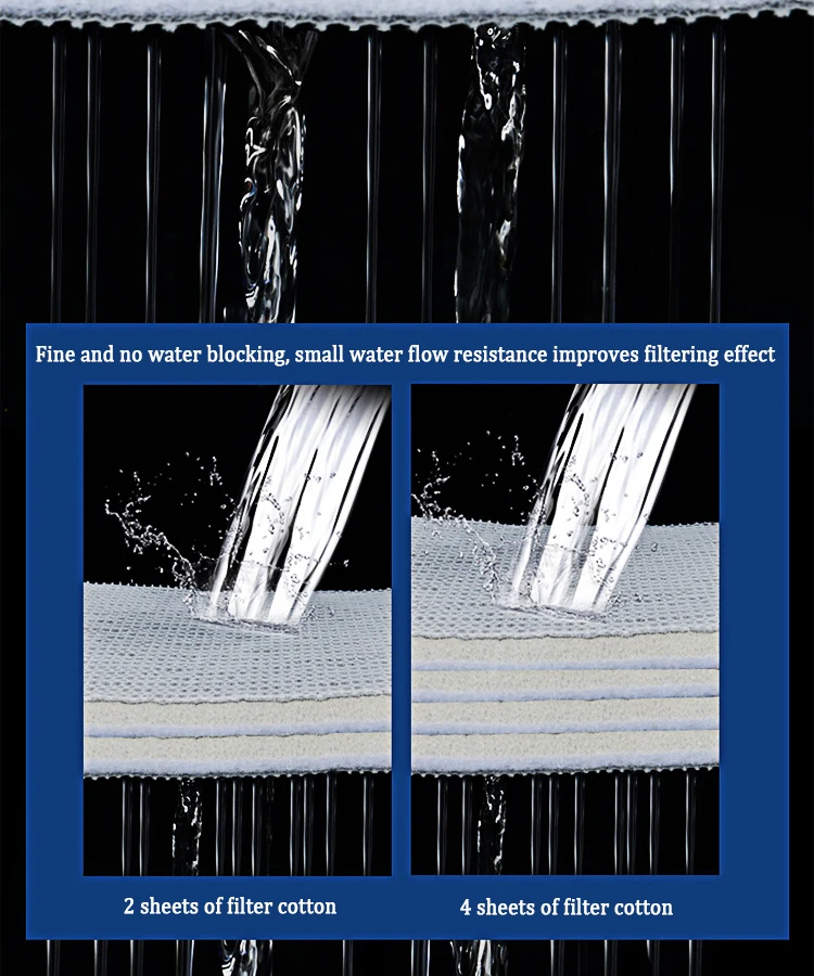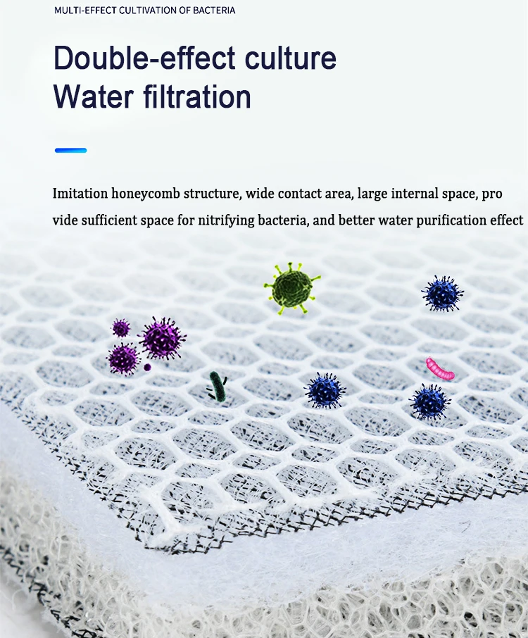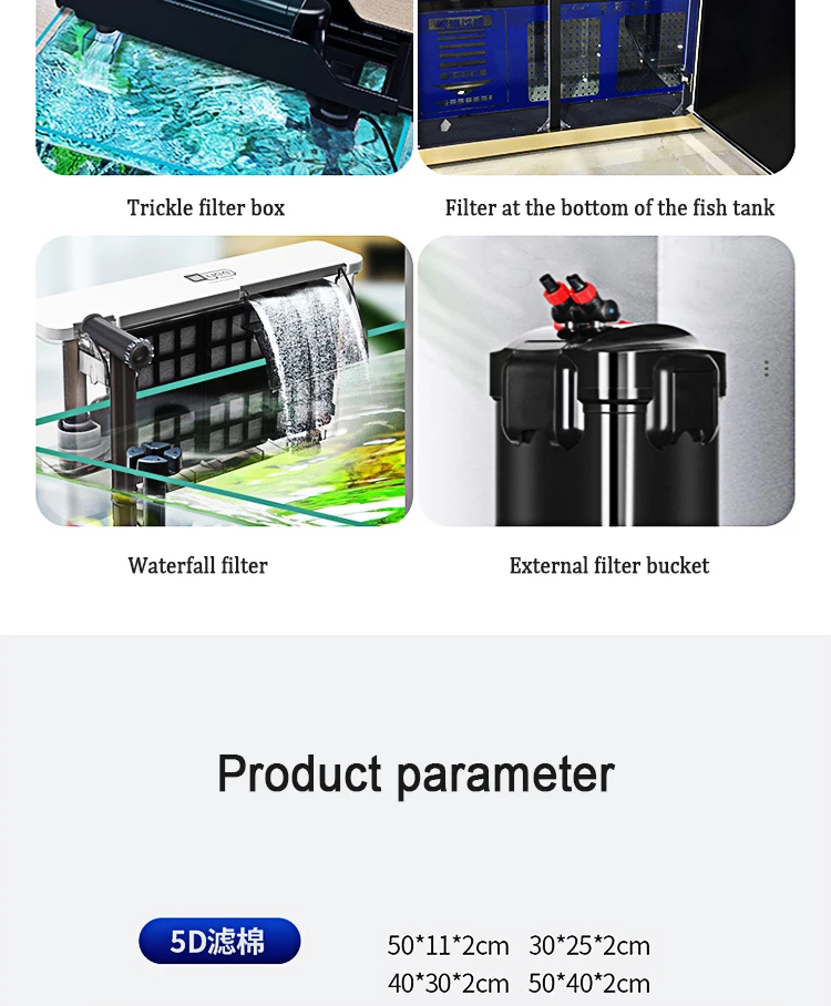Верхний и нижний два слоя-трехмерная сетчатая ткань и точная сетчатая ткань, а средние два слоя-без клея нано-Биохимический хлопок и волокнистый Биохимический хлопок. В общей сложности 6 слоев фильтрации, так что грязные вещи в аквариуме не могут спастись, и нитрифицирующие бактерии в аквариуме могут быть культивированы для реализации аквариума. Никаких изменений воды!