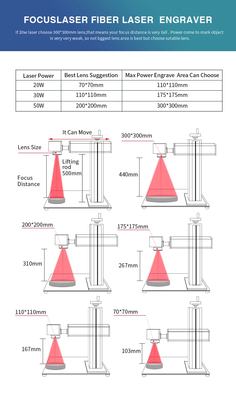 Если лазер 20 Вт выбирает объектив 300*300 мм, это означает, что расстояние фокусировки очень высокое. Мощность приходит к отметке объекта