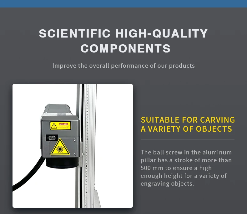 Шариковый винт в алюминиевой колонне имеет ход более 500 мм, чтобы обеспечить достаточно высокую высоту для различных объектов гравировки.