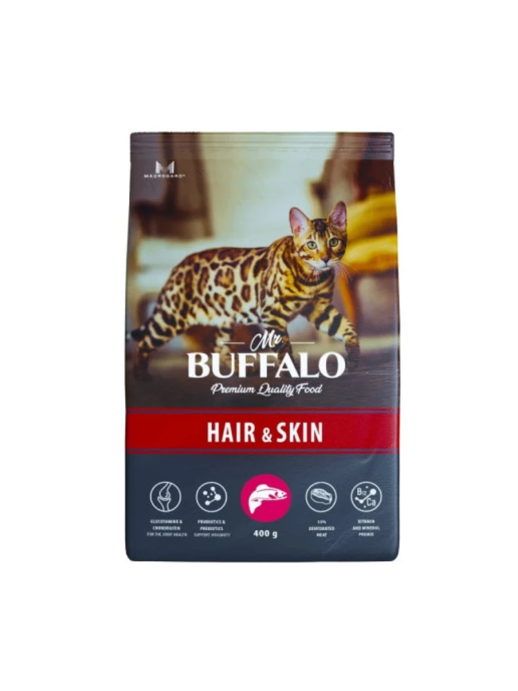 Полнорационный сухой корм Mr.Buffalo HAIR & SKIN с лососем для взрослых кошек и котов с чувствительной кожей. Содержит высококачественные ингредиенты и все необходимые питательные вещества, включая витамины группы В, витамин Е, цинк, клетчатку. За счет сбалансированного содержания Омега-3- и Омега-6 жирных кислот, эффективность которых доказана клиническими испытаниями, корм способствует поддержанию здоровья кожи и шерсти, а также крепкому иммунитету. Одним из ключевых компонентов корма Mr.Buffalo является уникальное запатентованное вещество MacroGard (МакроГард), которое является натуральным иммуностимулятором. Он активизирует естественные функции организма кошек и собак, помогает им бороться с инфекциями, поддерживает здоровое пищеварение, повышает сопротивляемость организма к бактериям, вирусам, грибкам и понижает риск различных заболеваний.