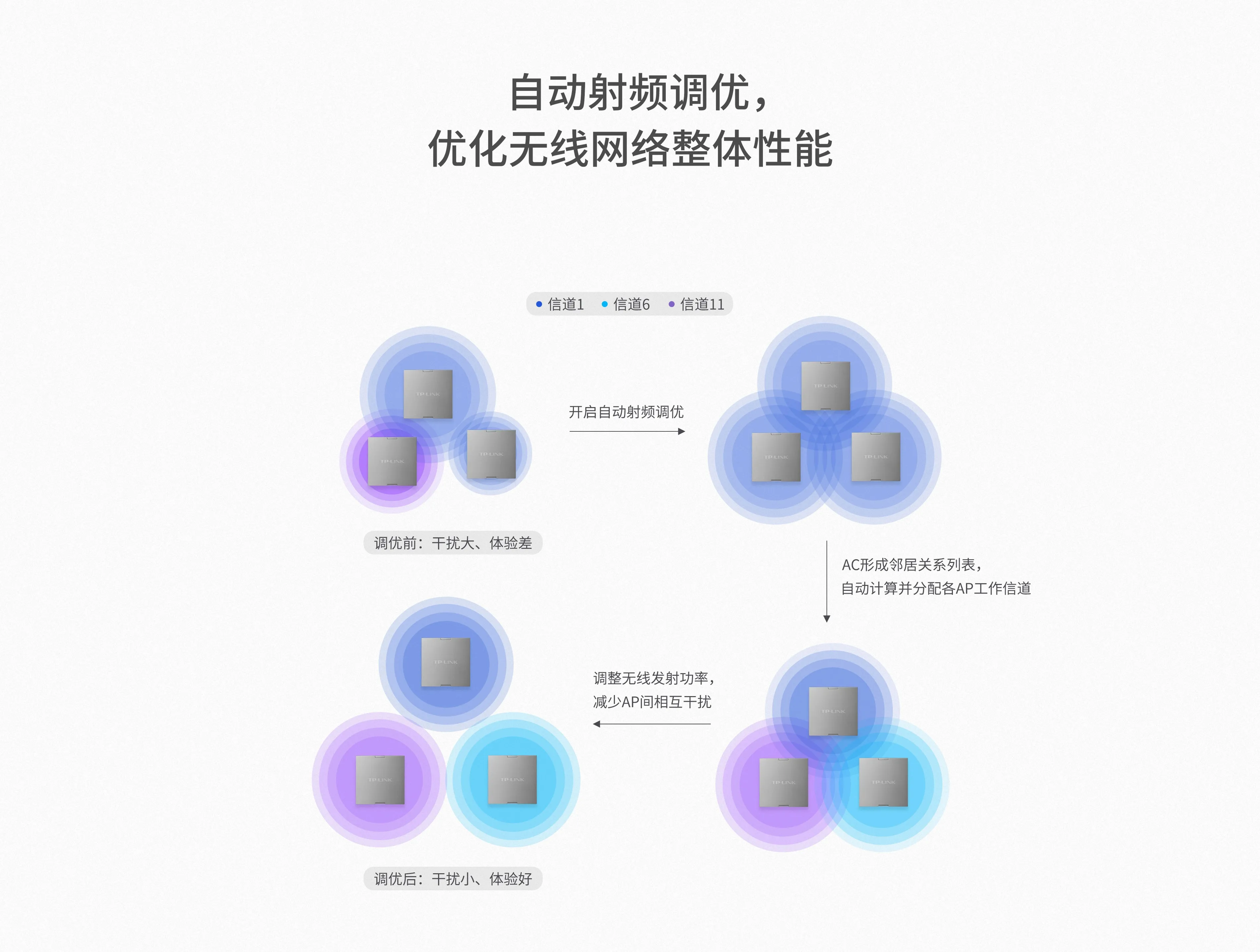 > Автоматическая Настройка радиочастот для оптимизации общей производительности беспроводной сети. Поддерживает автоматическую настройку радиочастот, автоматически вычисляет связь между AP в сети, И автоматически Отрегулируйте мощность беспроводной передачи и канал в соответствии с помехами в режиме реального времени и условиями нагрузки на соседние устройства, чтобы гарантировать, что общая беспроводная сеть всегда на высокой скорости, высокопроизводительное рабочее состояние.