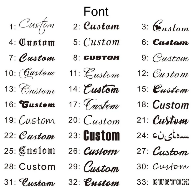 О: укажите свое имя или слова (Максимум 15 байт) И шрифт при оплате. (Такие как: Freya, шрифт 3) Если вы только сообщите нам имя, но не имеете шрифт, мы настроим шрифт для вас в соответствии с шрифт по умолчанию. Если вы даже не сообщите нам свое имя, мы отправим товар по умолчанию. Когда вы думаете об этом, не волнуйтесь, вы все еще можете связаться с нами, и мы будем продолжать настраивать его для вас.