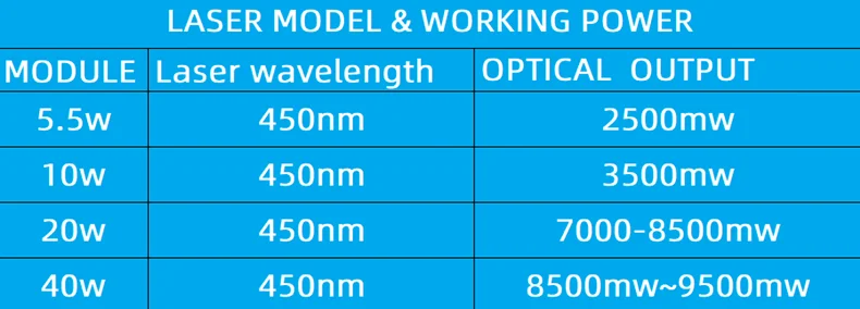 6. Сменная конструкция лазерного модуля поддерживает несколько мощностей. Мы предлагаем 4 варианта выходной мощности (5,5 Вт/10 Вт/20 Вт/40 Вт). Различные лазерные модули используются для гравировки/резки материалов разных типов и толщин.