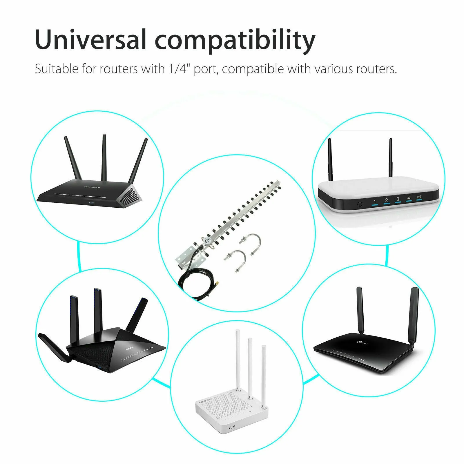 Совместим с модемами, беспроводными сетевыми картами и маршрутизаторами с 1/4 дюймовыми внешними антенными портами.