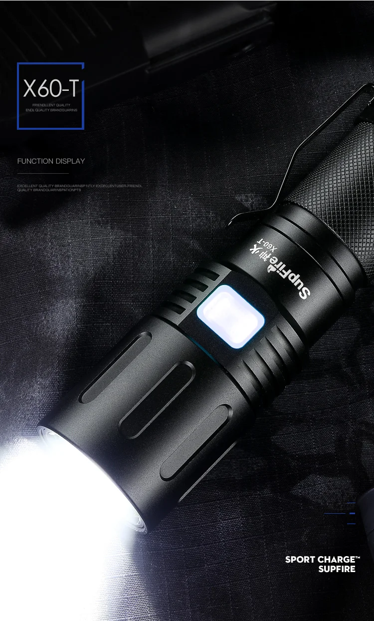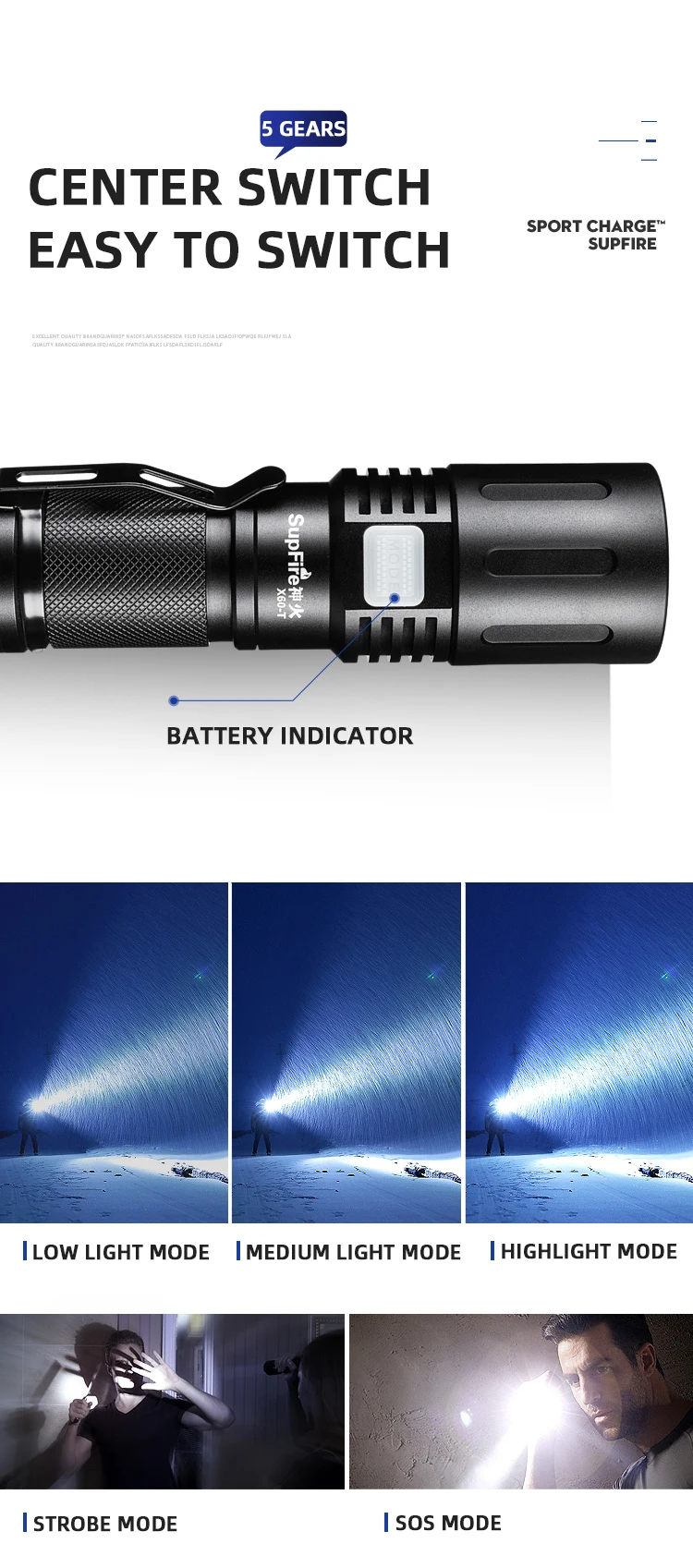 Одним нажатием передней кнопки, чтобы включить светильник, нажмите, чтобы отрегулировать передачу, (низкий светильник> средний Светильник> сильный светильник> мигание> SOS) пять режимов циклируются последовательно, длительное нажатие около 2 секунд, чтобы выключить.