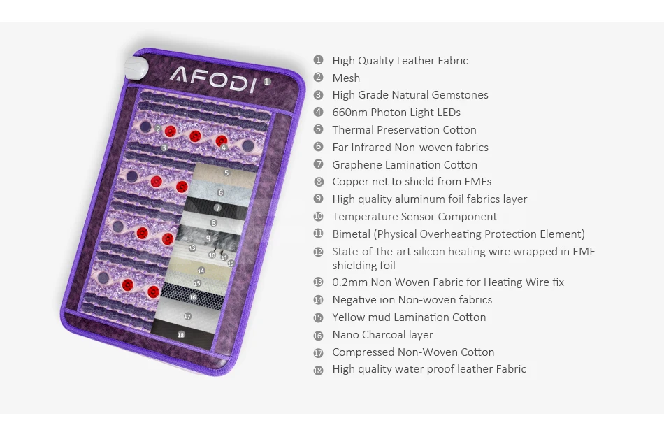 Эти коврики отличаются сверхмощной титановой системой отопления с нулевыми выбросами эмф. Когда матрас подключен, генерирует постоянный поток тепла, который окружает вас. Натуральный драгоценный камень выпускает много дальнего инфракрасного излучения. 12 фотонных светодиодов, испускающих Видимый монохромный красный светильник с длиной волны 660 нм. Все коврики и грелки AFODI генерируют много отрицательных ионов кристаллами и внутренними анионными слоями с желтой грязью и турмалиновыми тканями.
