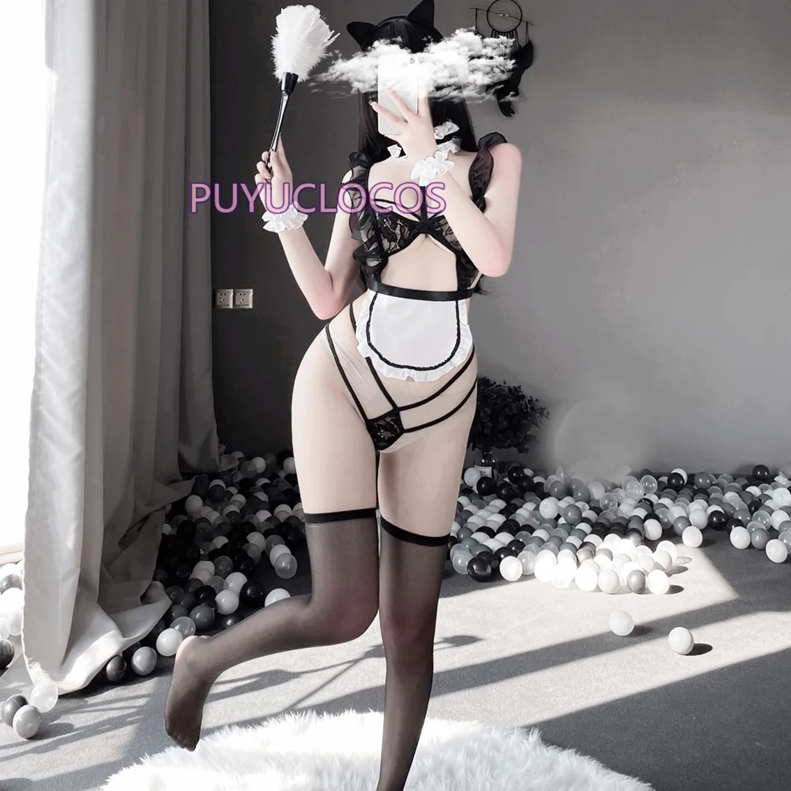 Бюстгальтер + стринги + фартук + браслет, кольца * 2 + чокер + повязка на голову + носки