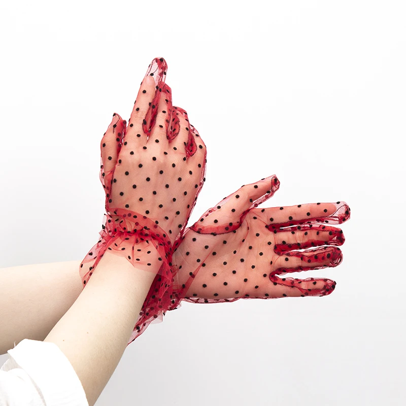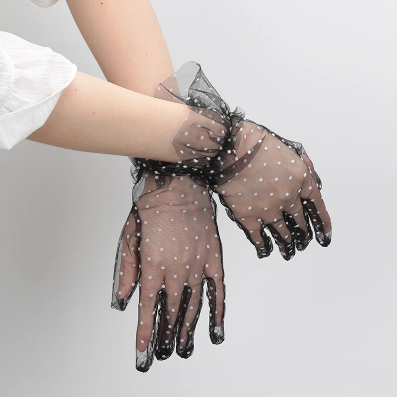 1 пара, сексуальные кружевные перчатки, в горошек, модные, для вождения, для женщин, короткие, из тюля, тянущиеся, с листьями лотоса, гибкие, сетчатые, свадебные, перчатки с полным пальцем