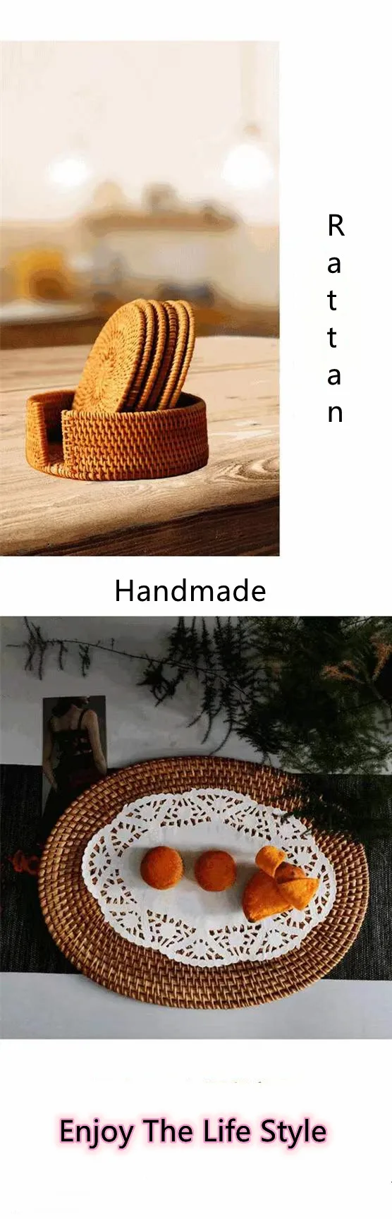 Безопасность для использования. Подставки из ротанга помогут вам защитить руки от горячей чашки кофе, чая, воды... и предотвратить царапины и ношение стола. А также обеспечивает дополнительную захватку на сушу, плотно приклеивается к рабочему столу, легко обрабатывает удары и капли.
