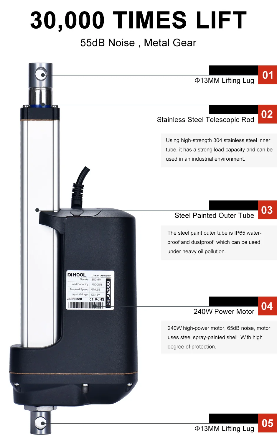 SRA12000 Промышленный высокий класс защиты электрический линейный привод принимает нержавеющая сталь внутренняя трубка, максимальная нагрузка составляет 12000N, максимальная самоблокирующийся силы 1,5 тонн, а максимальная скорость вращения составляет 60 мм/сек.. Для работы привода Используется двигатель DC12V / DC24V / DC36V / DC48V. Продукт принимает Порошковые металлургические шестерни, которые являются износостойкими, высокопрочными и долговечными; Встроенная печатная плата PCB, защита от перегрузки, встроенный ограничительный выключатель, может автоматически останавливаться; класс IP68 водонепроницаемый, пыленепроницаемый, маслостойкий и антикоррозийный. Промышленные Линейные Приводы имеют двойную защиту сцепления, которая может эффективно предотвратить повреждение толкателя, вызванное более высокими нагрузками продукта.