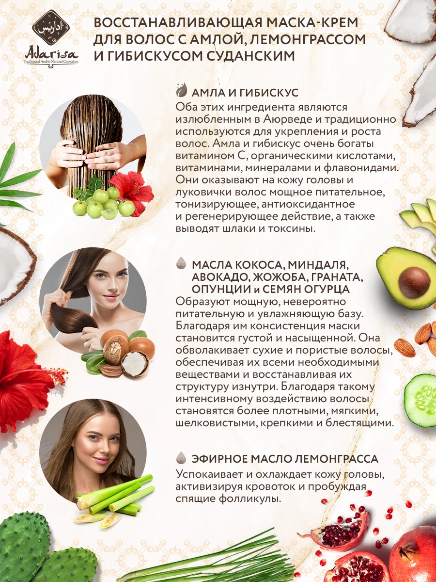 Крем-маска для интенсивного укрепления слабых и безжизненных волос, а также для их глубокого увлажнения. Амла вкупе с гибискусом выступают в качестве витаминизирующих ингредиентов. Богатые аскорбиновой кислотой, органическими кислотами и рядом важных минералов, эти компоненты стимулируют мощное питание кожного покрова головы, оказывая эффективное тонизирующее воздействие с мощным антиоксидантным эффектом. Они продуктивно насыщают клеточки эпителия всем необходимым для быстрого процесса регенерации, выводят шлаки и вредные токсины. Эфирное масло лимонника заметно усиливает свойства перечисленных компонентов. Витаминизирующий и увлажняющий базис косметического средства составляют масла кокоса и авокадо, эфирные концентраты граната и миндаля, кактуса опунции и жожоба, а также лекарственных огуречных семян. Регулярное использование этой крем-маски ликвидирует процессы выпадения волос, активизирует укрепление и рост, густоту и гладкость волос, преисполненных силой и эластичностью.