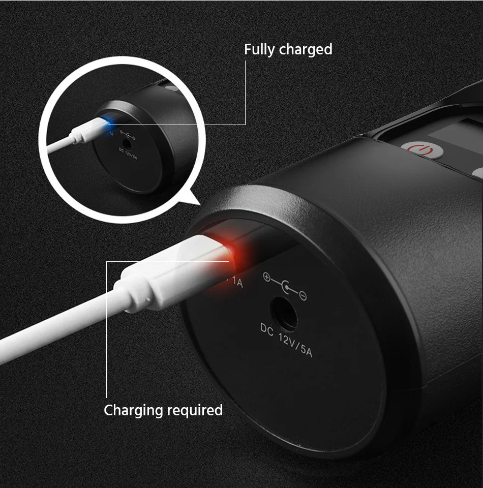 Воздушный насос через USB кабель для зарядки, когда дисплей питания красный от имени необходимости зарядки, дисплей зеленый от имени полного.