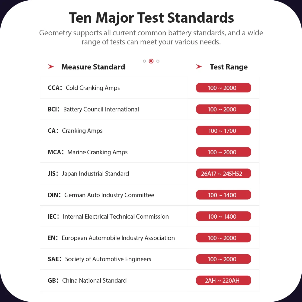 Геометрия поддерживает все текущие общие стандарты батареи, и широкий спектр тестов может удовлетворить ваши различные потребности.