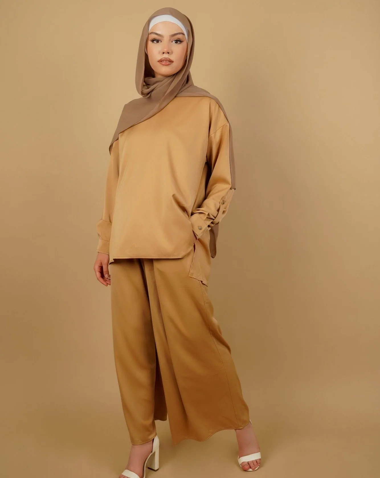M: ширина плеч 60 см, обхват груди 106 см, рукав 50 см, длина топа 67 см, обхват талии 72 см, длина брюк 101 см